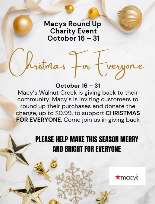 This October, Macys stores across the country are partnering with local charities. From October 16 – 31, when you shop at Macy’s WALNUT CREEK, you can round up your purchase and donate your change, up to $0.99, to benefit CHRISTMAS FOR EVERYONE.